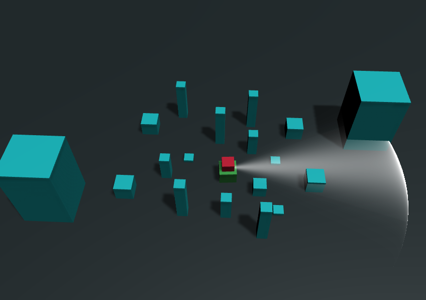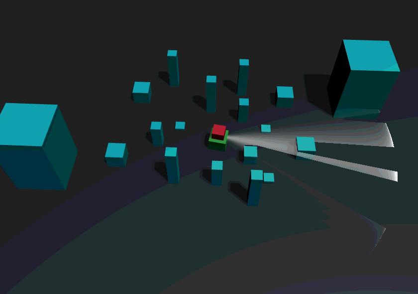 当这个视线光锥开始扫描的时候,为了表达更加真实的效果,在出现扫描到障碍物的时候,会出现光线被遮挡的效果。如图所示:当光锥扫描到前面的障碍物的时候,会出现光线被遮挡的效果。