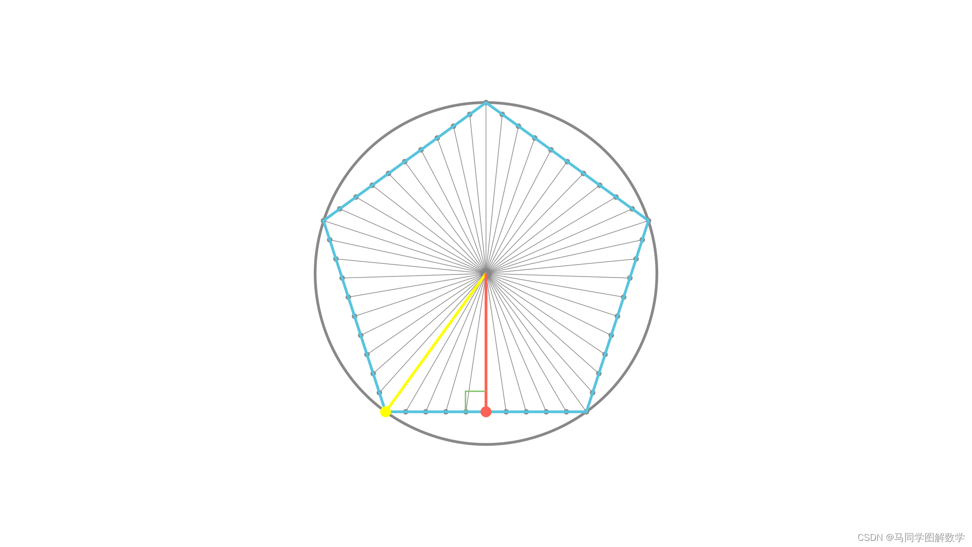 如果最长距离与最短距离相等,那么多边形上每个点到圆心的距离就都相等了。而随着边数的增加,我们可以看到,这两者的距离确实是在靠近