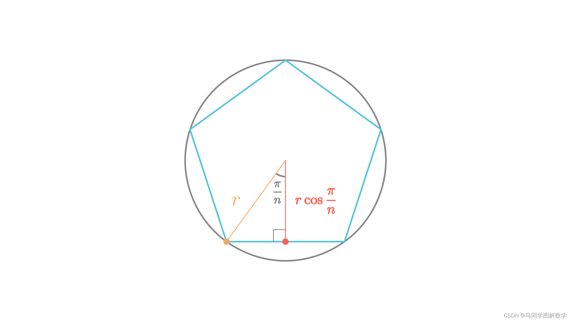 这就意味着最长的距离、最短的距离在边数为无穷时会相等。所以内接无穷边多边形就是圆。那么根据内接无穷边多边形的面积为 ,就可以推出圆的面积为