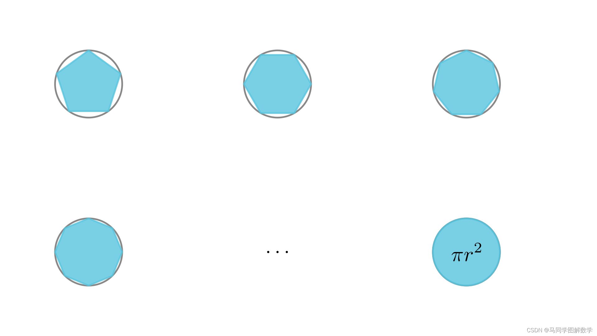 但是,这里存在一个逻辑漏洞,内接正五边形不是圆、内接正六边形不是圆,内接正七、正八边形都不是圆。既然之前的多边形都不是圆,那么最终得到的无穷多边形的面积真的是圆的面积吗?本视频就来回答这个问题