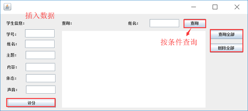 import javax.swing.border.EmptyBorder;import com.mysql.jdbc.PreparedStatement;public class MainFrame extends JFrame {private static final long serialVersionUID = 1273115169936569895L;private JPanel contentPane;private JTextField stuId;private JTextField stuName;private JTextField stuSubject;private JTextField stuContent;private JTextField stuPosture;private JTextField stuSound;private JTextField name;Connection conn = null;Statement st = null;ResultSet rs = null;PreparedStatement pst = null;public static ArrayList<Student> list = new ArrayList<Student>();;private TextArea show = new TextArea();StringBuilder sb = null;//FileOutputStream fos = null;/*** Launch the application.*/public static void main(String[] args) {EventQueue.invokeLater(new Runnable() {public void run() {try {InputStream fileInputStream =null;ObjectInputStream objis =null;try {fileInputStream= new FileInputStream("D:\\QQQ\\committeeFile.txt");objis = new ObjectInputStream(fileInputStream);list = (ArrayList<Student>)objis.readObject();if(list.size()==0){list= new ArrayList<>();}} catch (Exception e2) {// TODO: handle exceptionSystem.out.println(e2.toString());}finally{if(fileInputStream!=null){try {fileInputStream.close();} catch (IOException e1) {// TODO Auto-generated catch blocke1.printStackTrace();}}if(objis!=null){try {objis.close();} catch (IOException e1) {// TODO Auto-generated catch blocke1.printStackTrace();}}}MainFrame frame = new MainFrame();frame.setVisible(true);} catch (Exception e) {e.printStackTrace();}}});}/*** Create the frame.*/public MainFrame() {setDefaultCloseOperation(JFrame.EXIT_ON_CLOSE);setBounds(100, 100, 820, 369);contentPane = new JPanel();contentPane.setBorder(new EmptyBorder(5, 5, 5, 5));setContentPane(contentPane);JLabel label = new JLabel("\u5B66\u751F\u4FE1\u606F\uFF1A");label.setBounds(20, 20, 90, 21);JLabel label_1 = new JLabel("\u5B66\u53F7\uFF1A");label_1.setBounds(20, 56, 54, 21);JLabel label_2 = new JLabel("\u59D3\u540D\uFF1A");label_2.setBounds(22, 87, 54, 21);stuId = new JTextField();stuId.setBounds(80, 50, 96, 27);stuId.setColumns(10);stuName = new JTextField();stuName.setBounds(80, 84, 96, 27);stuName.setColumns(10);JLabel lblNewLabel = new JLabel("\u4E3B\u9898\uFF1A");lblNewLabel.setBounds(20, 123, 54, 21);stuSubject = new JTextField();stuSubject.setBounds(82, 120, 96, 27);stuSubject.setColumns(10);JLabel label_3 = new JLabel("");label_3.setBounds(25, 156, 0, 0);JLabel label_4 = new JLabel("\u5185\u5BB9\uFF1A");label_4.setBounds(22, 162, 54, 21);stuContent = new JTextField();stuContent.setBounds(82, 159, 96, 27);stuContent.setColumns(10);JLabel label_5 = new JLabel("\u4F53\u6001\uFF1A");label_5.setBounds(20, 198, 54, 21);stuPosture = new JTextField();stuPosture.setBounds(83, 195, 96, 27);stuPosture.setColumns(10);JLabel lblNewLabel_1 = new JLabel("\u58F0\u97F3\uFF1A");lblNewLabel_1.setBounds(23, 235, 54, 21);stuSound = new JTextField();stuSound.setBounds(83, 232, 96, 27);stuSound.setColumns(10);JButton ratingBtn = new JButton("\u8BC4\u5206");ratingBtn.setBounds(24, 274, 155, 29);ratingBtn.addActionListener(new ActionListener() {public void actionPerformed(ActionEvent e) { // 评分if(e.getActionCommand().equals("评分")){try {String sId = stuId.getText();String sName = stuName.getText();String sSub = stuSubject.getText();String sCon = stuContent.getText();String sPro = stuPosture.getText();String sSound = stuSound.getText();Class.forName("com.mysql.jdbc.Driver");conn = DriverManager.getConnection("jdbc:mysql://localhost:3306/test1", "root", "");st = conn.createStatement();String sql = "insert IGNORE into student values(?,?,?,?,?,?)";PreparedStatement pst = (PreparedStatement)conn.prepareStatement(sql);pst.setObject(1,sId);pst.setObject(2,sName);pst.setObject(3,sSub);pst.setObject(4,sCon);pst.setObject(5,sPro);pst.setObject(6,sSound);pst.executeUpdate(); FileOutputStream fos = new FileOutputStream("D:\\QQQ\\committeeFile.txt");ObjectOutputStream oos = new ObjectOutputStream(fos);oos.writeObject(list);oos.flush();oos.close();}catch (Exception ex) {// TODO Auto-generated catch blockex.printStackTrace();} finally {//5.释放资源 关闭连接try {if(rs!=null) {rs.close();}if(st!=null) {st.close();}if(conn!=null) {conn.close();}} catch (SQLException ex) {// TODO Auto-generated catch blockex.printStackTrace();}}}}});JTextArea show = new JTextArea();show.setBounds(199, 55, 463, 248);JButton selectAllBtn = new JButton("\u67E5\u8BE2\u5168\u90E8");selectAllBtn.setBounds(677, 52, 106, 29);selectAllBtn.addActionListener(new ActionListener() {public void actionPerformed(ActionEvent e) { // 查询全部try {Class.forName("com.mysql.jdbc.Driver");conn = DriverManager.getConnection("jdbc:mysql://localhost:3306/test1", "root", "");st = conn.createStatement();rs = st.executeQuery("select * from student");sb = new StringBuilder();while(rs.next()) {//通过数据库字段名称得到对应的值String sId = rs.getString("sId");String sName = rs.getString("sName");String sSub = rs.getString("sSub");String sCon = rs.getString("sCon");String sPro = rs.getString("sPro");String sSound = rs.getString("sSound");sb.append("学号:"+sId+","+"姓名:"+sName+","+"主题:"+sSub+","+"内容:"+sCon+","+"体态:"+sPro+","+"声音:"+sSound+"\n");show.setText(sb.toString());}} catch (Exception ex) {System.out.println("读取文件内容出错");ex.printStackTrace();}finally {//5.释放资源 关闭连接try {if(rs!=null) {rs.close();}if(st!=null) {st.close();}if(conn!=null) {conn.close();}}catch (SQLException ex) {// TODO Auto-generated catch blockex.printStackTrace();}}}});JLabel label_6 = new JLabel("\u67E5\u8BE2\uFF1A");label_6.setBounds(199, 20, 54, 21);JLabel label_7 = new JLabel("\u59D3\u540D\uFF1A");label_7.setBounds(413, 20, 54, 21);name = new JTextField();name.setBounds(482, 17, 96, 27);name.setColumns(10);JButton selectBtn = new JButton("\u67E5\u8BE2");selectBtn.addActionListener(new ActionListener() {public void actionPerformed(ActionEvent e) { //通过姓名查询try {ResultSet rs = null;Class.forN