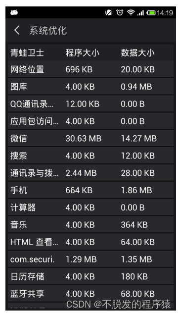 通过系统API提供的包管理器获取每个应用程序所占的存储空间,并通过ListView展示给用户,由于Google工程师为了提升Android系统的安全性,没有Root权限不能删除其他应用的数据信息,本应用的实现方式是当用户点击某个应用条目时,通过显式意图跳转到系统自带应用数据信息清理界面清理缓存数据。