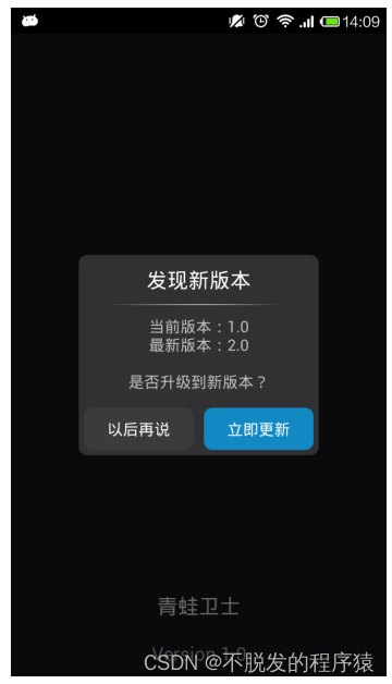 升级对话框采用自定义的对话框,创建一个自定义对话框类继承于Dialog类,其关键是编写自定义布局文件和重写构造方法,实现该对话框能在应用的其他功能模块中能重用。