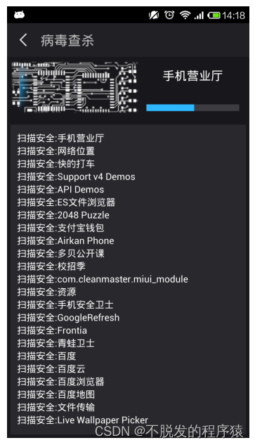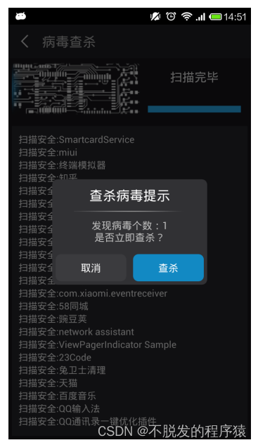 手机安全厂商和各大应用市场收集了市面上常见的病毒软件,本功能需要收集他们所提供的病毒软件的包名,将其存储到本地数据库中,在执行病毒扫描的时候将手机中所有已安装的用户程序包名与病毒数据库中的包名进行对比,如果相同则询问用户是否卸载该应用程序。