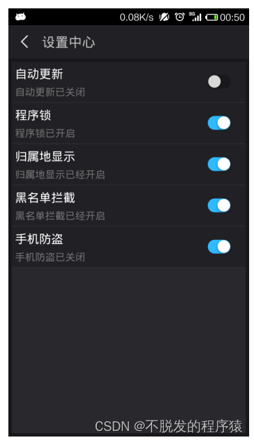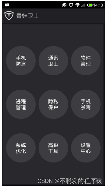 系统设置界面的难点是通过自定义组合控件的方式实现自定义view,从而使每一个设置条目只需要引用一个组件,实现代码的复用。为了防止用户打开android系统自带的设置界面关掉安全卫士中的某些服务出现脏数据,每次显示该界面的时候必须在onStart方法内重新获取最新数据。