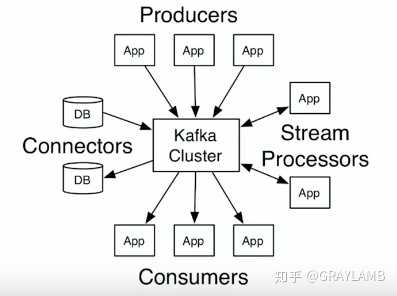 - 流处理App:kafka可以很好的支持流处理(支持很多“流API”),一些流处理框架下的App可以接入kafka,并且可以实时的获取变化的数据和消息,对消息进行处理后可以立刻存回kafka,等待其它Consumers调用。