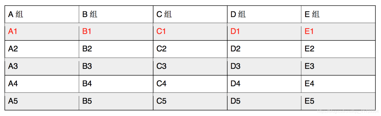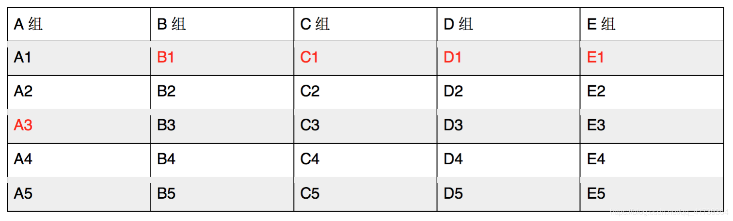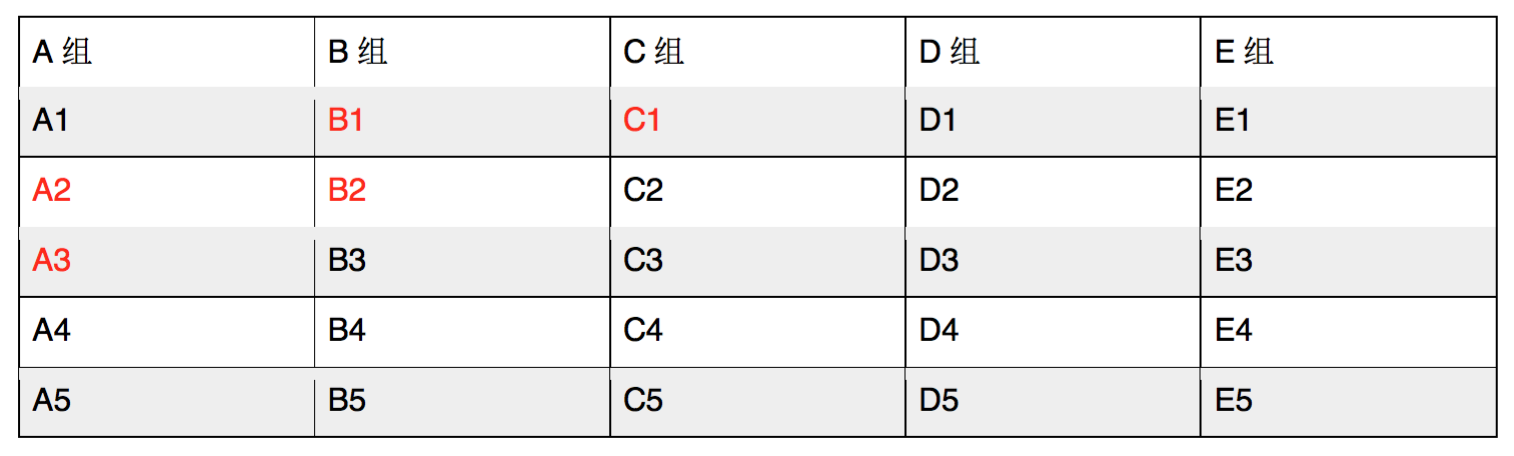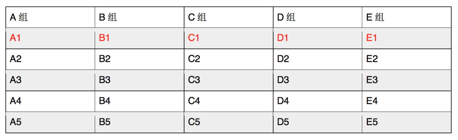 而后让每个组分别比赛,排出各组的名次来。我们假设他们的名次就是他们在小组中的编号,即A组的名次是A1、A2、A3、A4、A5,B组和其它组的名次也是类似(如下图):