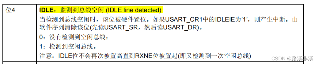 空闲中断是接收到一个数据以后,接收停顿超过一字节时间认为桢收完,总线空闲中断是在检测到在接收数据后,数据总线上一个字节的时间内,没有再接到数据后发生。也就是RXNE位被置位之后,才开始检测,只被置位一次,除非再次检测到RXNE位被置位,然后才开始检测下一次的总线空闲。一次RXNE位被置位只进行一次。