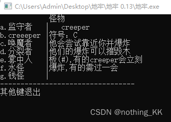 这是一个基于 c + + 的由字符组成的世界。在游戏中,你需要按 w,a,s,d 键,从而让角色在地图中移动。发现像符号“ J”这样的怪物是很正常的。要攻击他们,你需要按 e 键。最终,你会找到一个有“ E”的房间。这是地牢的出口,这样你就赢了。随着游戏的推进,会有越来越多的新怪物,带来新挑战。到目前为止,我已经完成了40个关卡,有一定难度。随着更新我会创建更多的关卡。现在,轮到你了,冒险家!