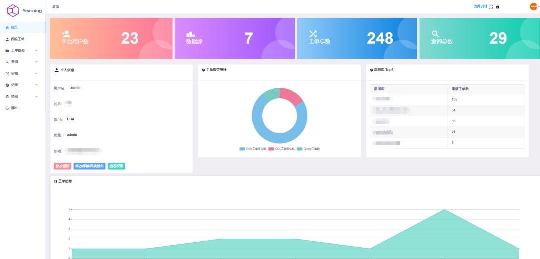 dashboard主要展示Yearning各项数据包括用户数/数据源数/工单数/查询数以及其他图表,个人信息栏内用户可以修改密码/邮箱/真实姓名,同时可以查看该用户权限以及申请权限