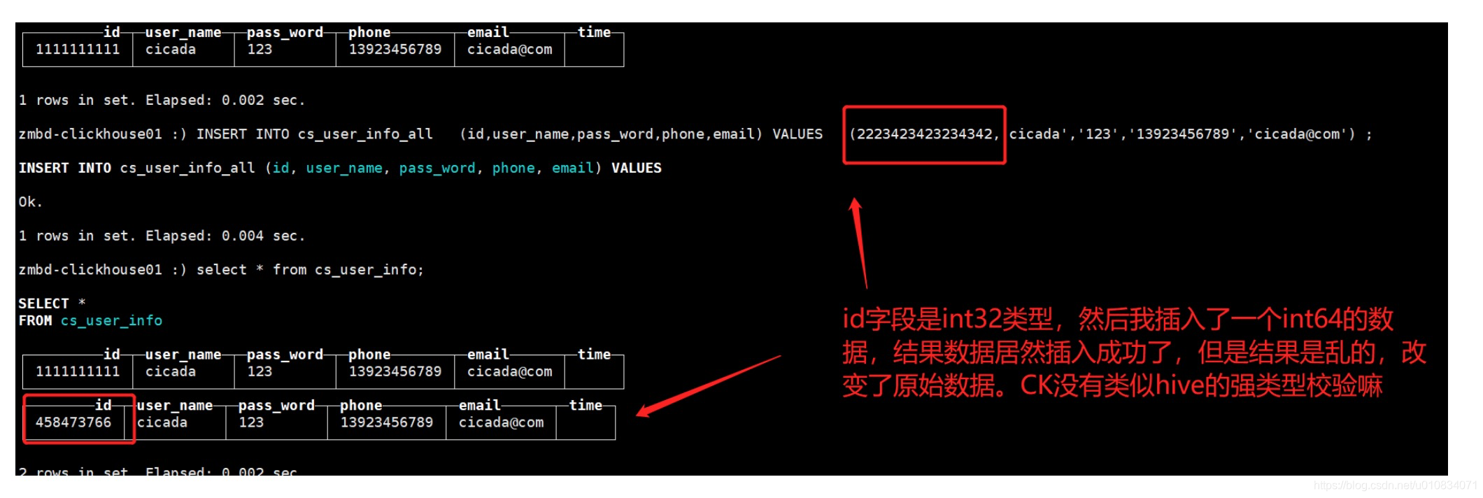 注:如果我们建表的时候指定数据类型为int32,但是数据插入时不小心插入了一个超过int32范围的数据,最终存到表里的数据会被ClickHouse内部机制进行截取,造成数据不一致