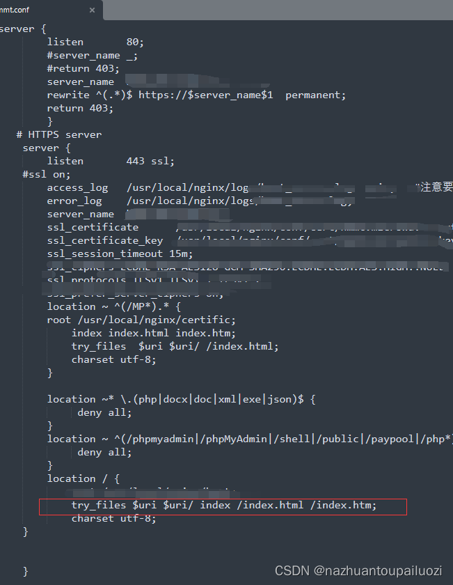 location / { root /usr/local/nginx/----; try_files $uri $uri/ index /index.html /index.htm; charset utf-8; }