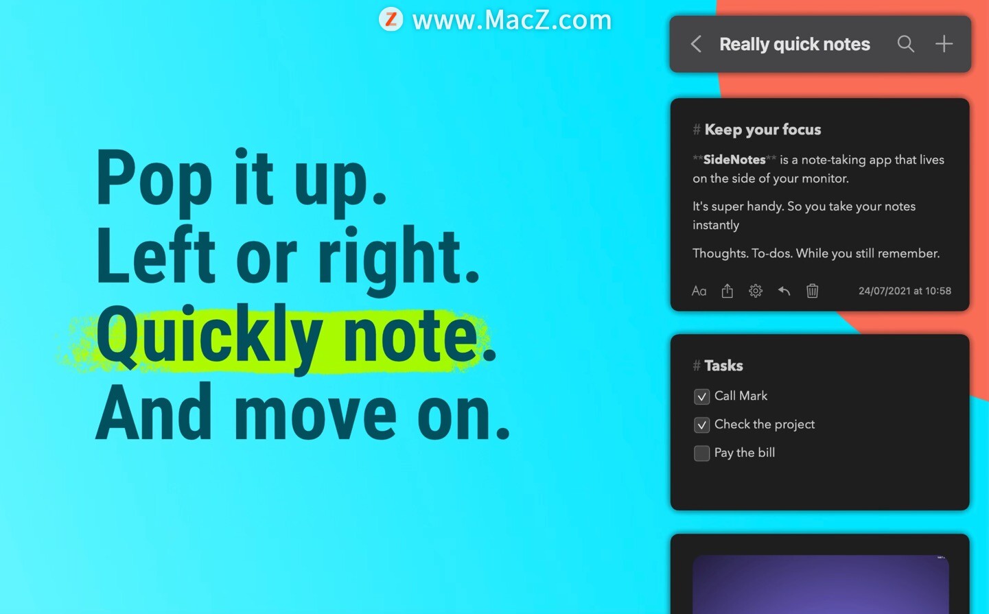 电话号码、链接、屏幕截图。现在将它们放在 SideNotes 中,然后将它们移至您的写作应用程序或任务管理器,或者让它们在 SideNotes 中触手可及。