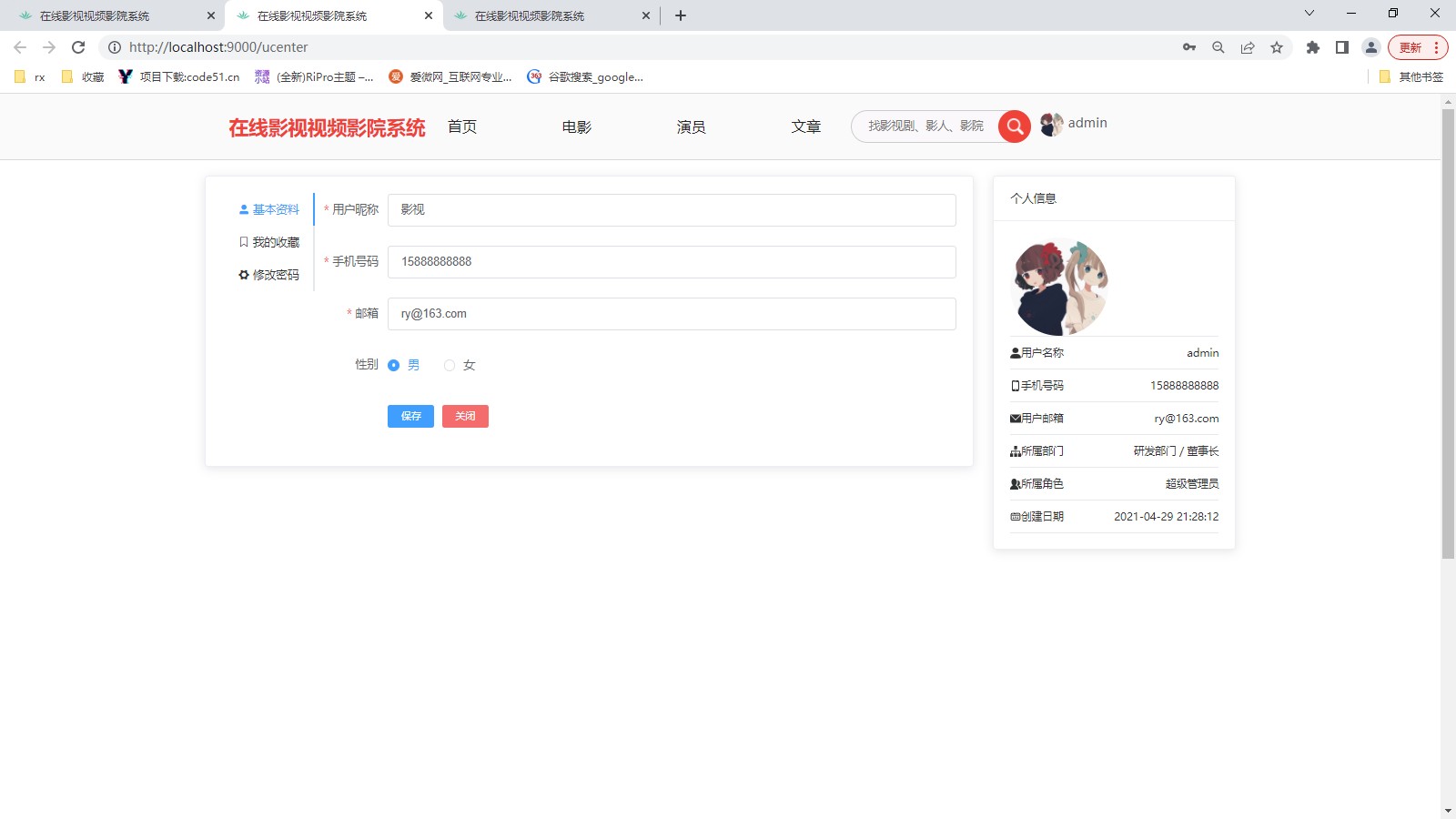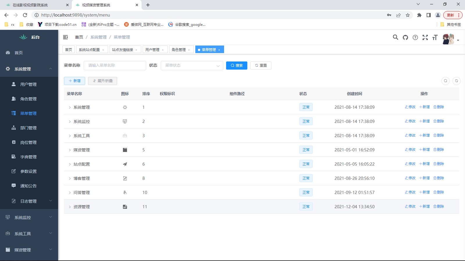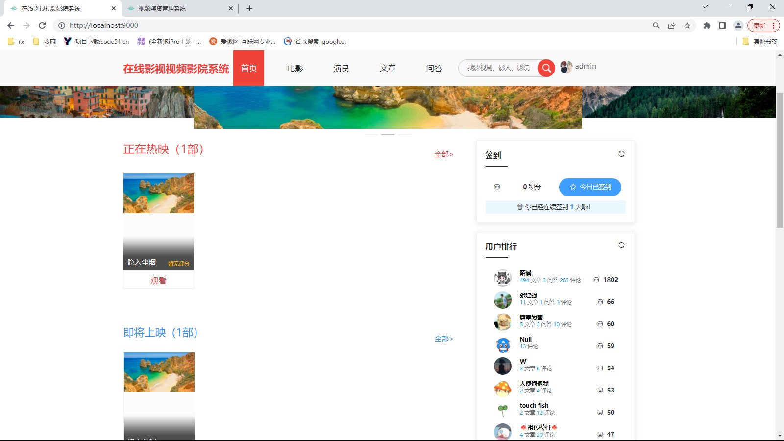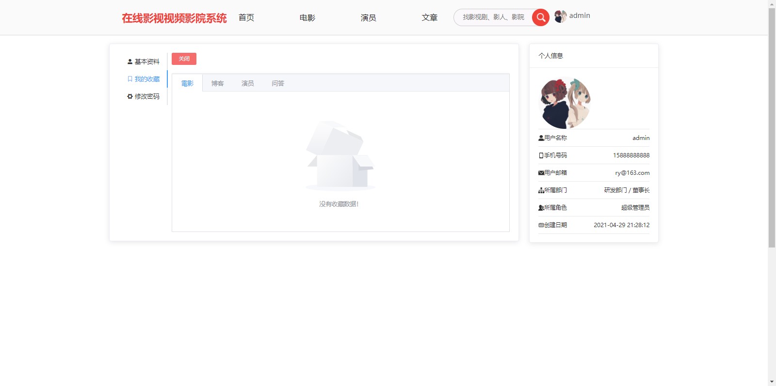 基于SSM+SpringBoot+Vue前后端分离的在线影视视频影院管理系统,包含普通用户,超级管理员角色,整体功能包含视频观看,签到,收藏,登录注册,检索,文章查看,演员整容列表,个人中心,个人信息修改,收藏列表,密码修改,用户管理,角色管理,菜单管理,岗位管理,字典管理,参数设置,通知公告,日志查看,部门管理,电影分类管理,电影管理,演员管理,电影标签,站点配置信息,博客文章管理,标签管理,专题管理,博客分类,网盘资源等。