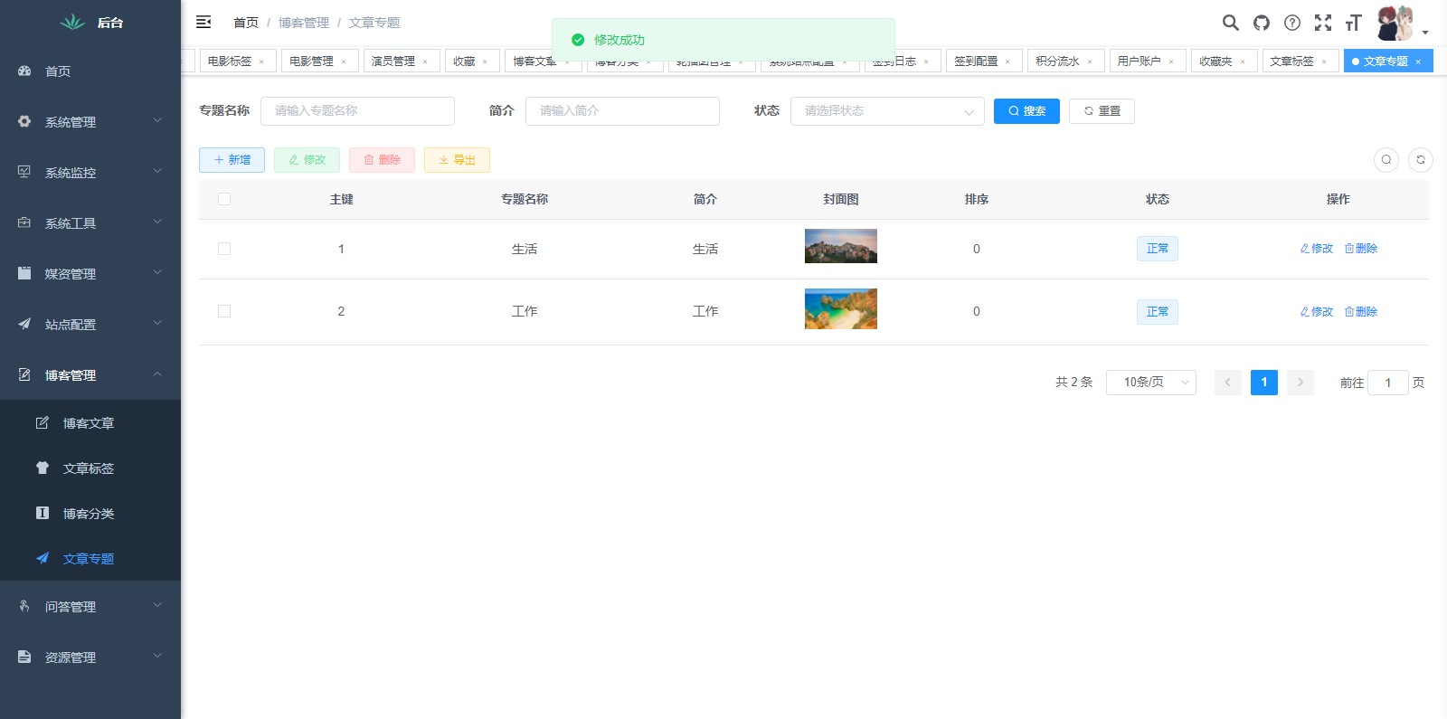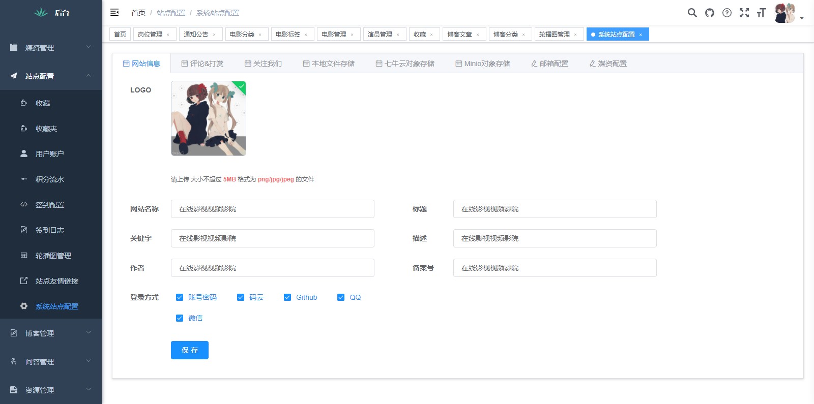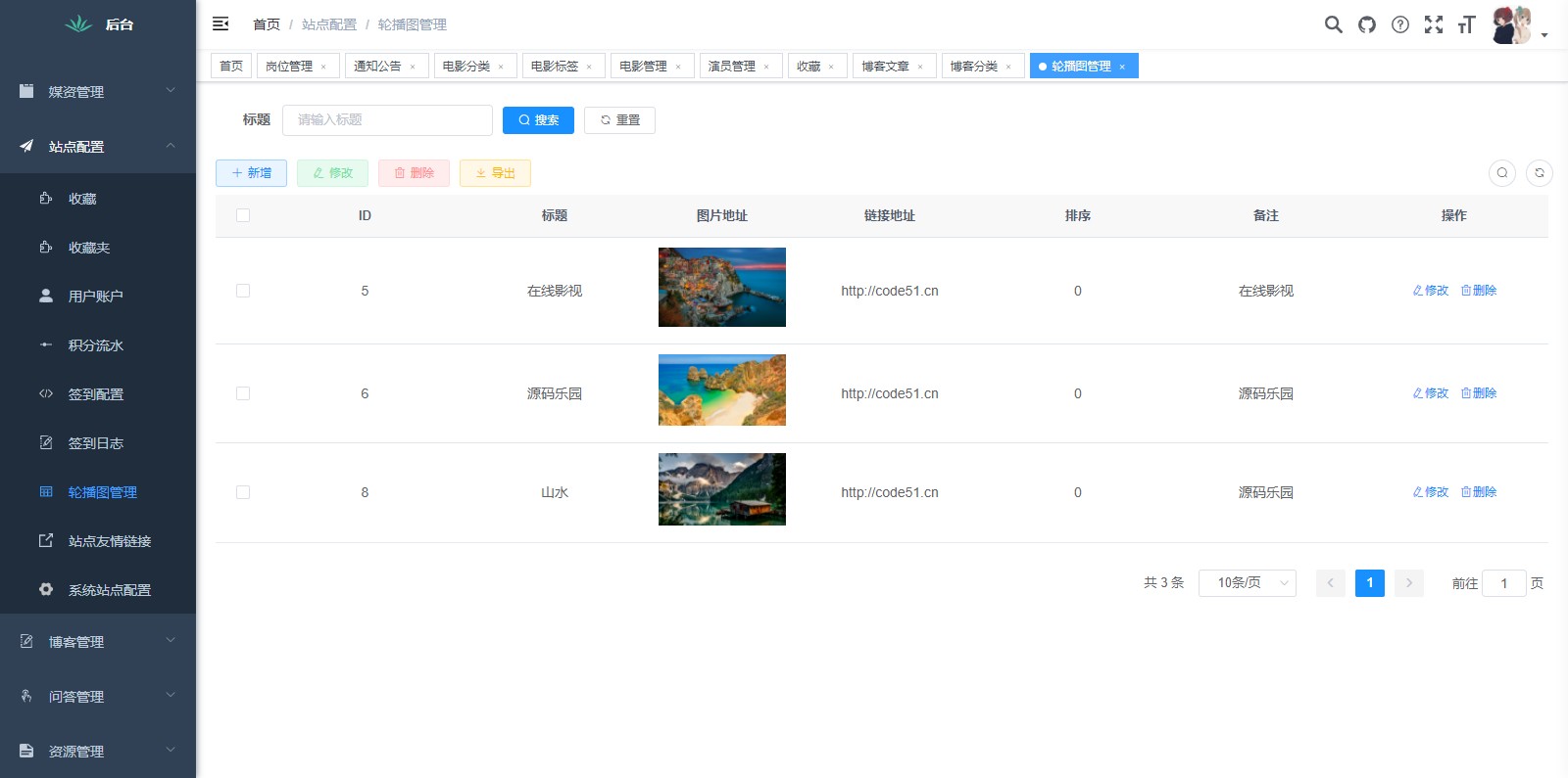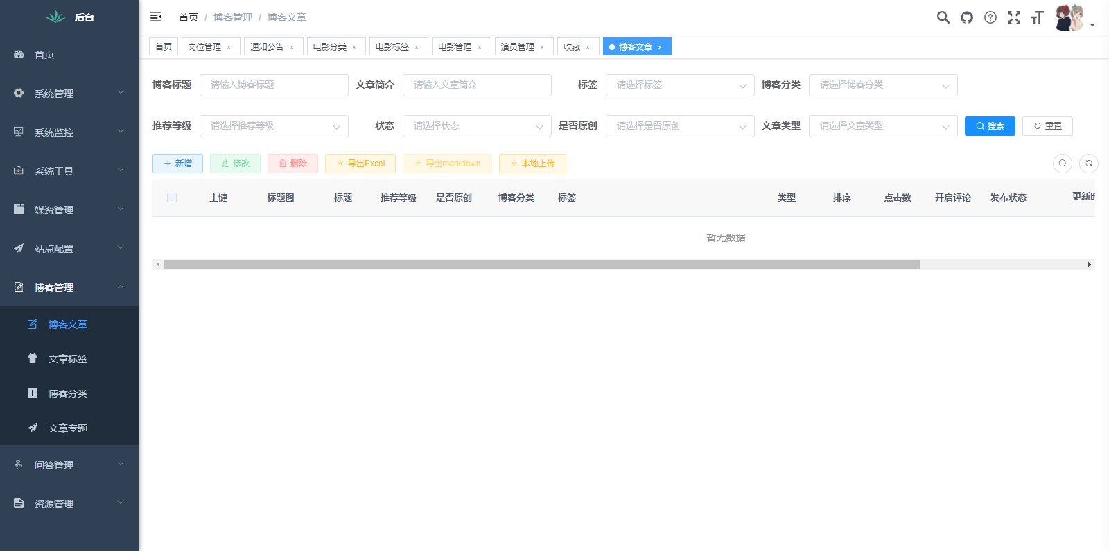 基于SSM+SpringBoot+Vue前后端分离的在线影视视频影院管理系统,包含普通用户,超级管理员角色,整体功能包含视频观看,签到,收藏,登录注册,检索,文章查看,演员整容列表,个人中心,个人信息修改,收藏列表,密码修改,用户管理,角色管理,菜单管理,岗位管理,字典管理,参数设置,通知公告,日志查看,部门管理,电影分类管理,电影管理,演员管理,电影标签,站点配置信息,博客文章管理,标签管理,专题管理,博客分类,网盘资源等。