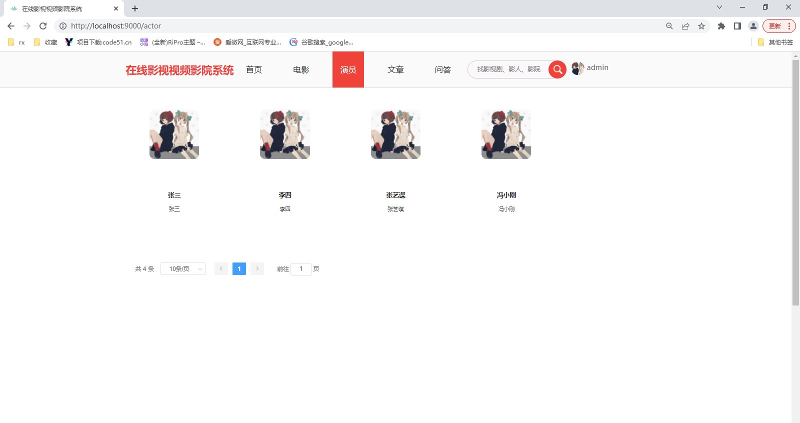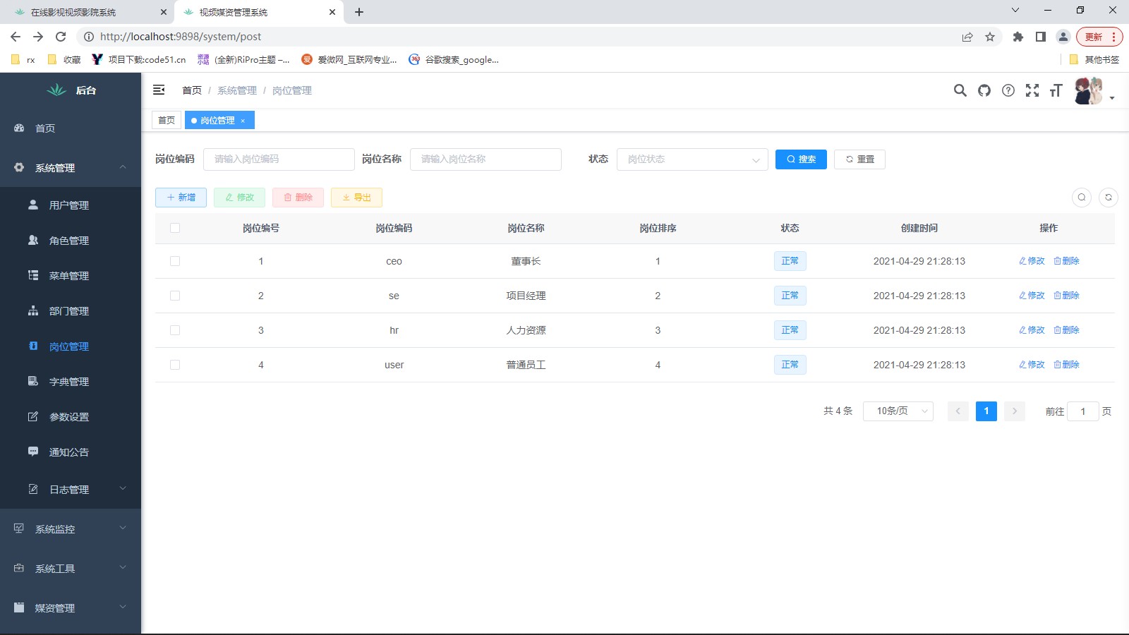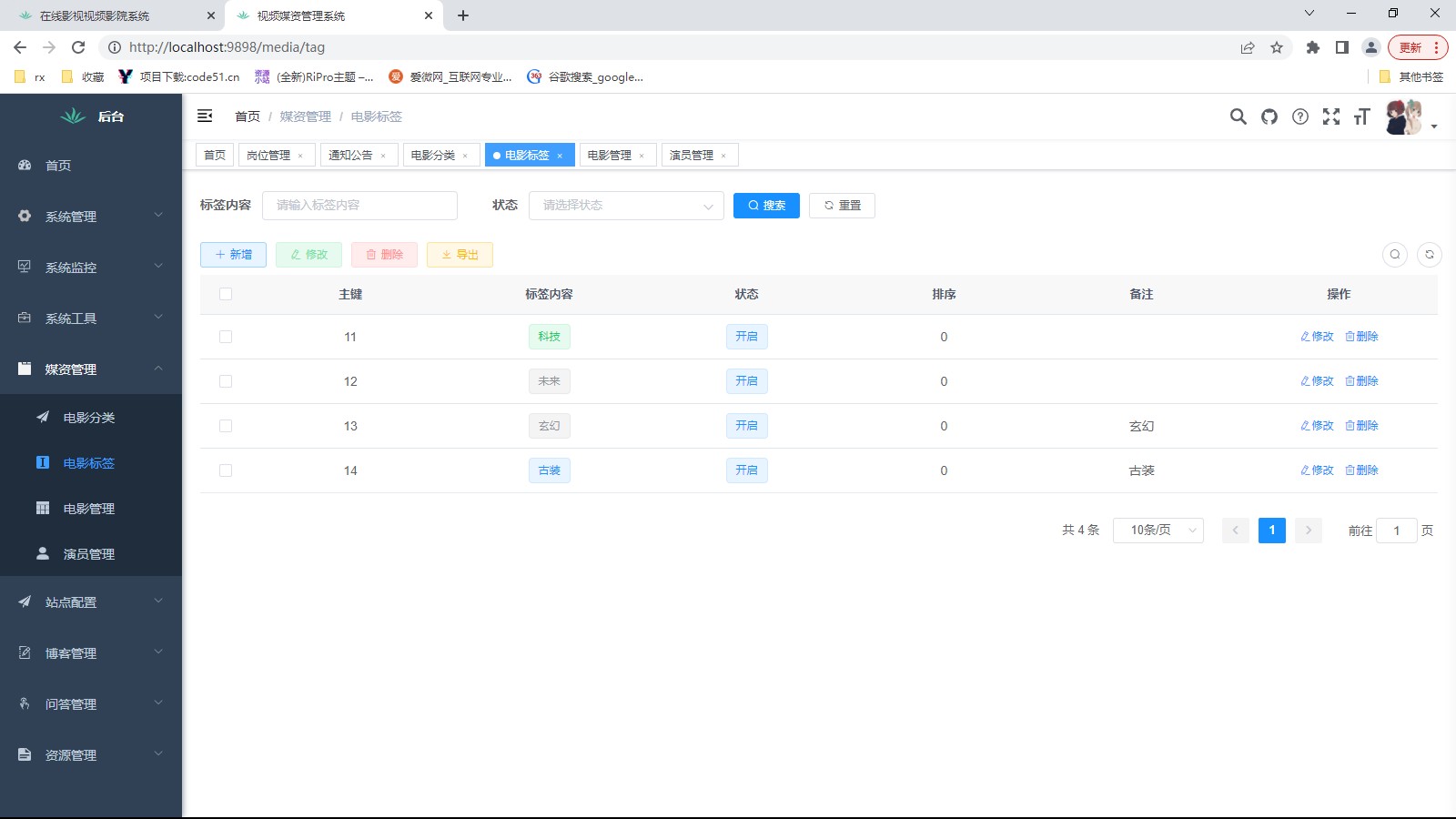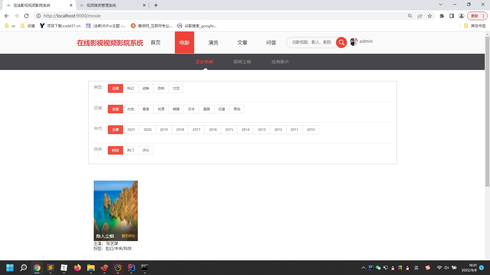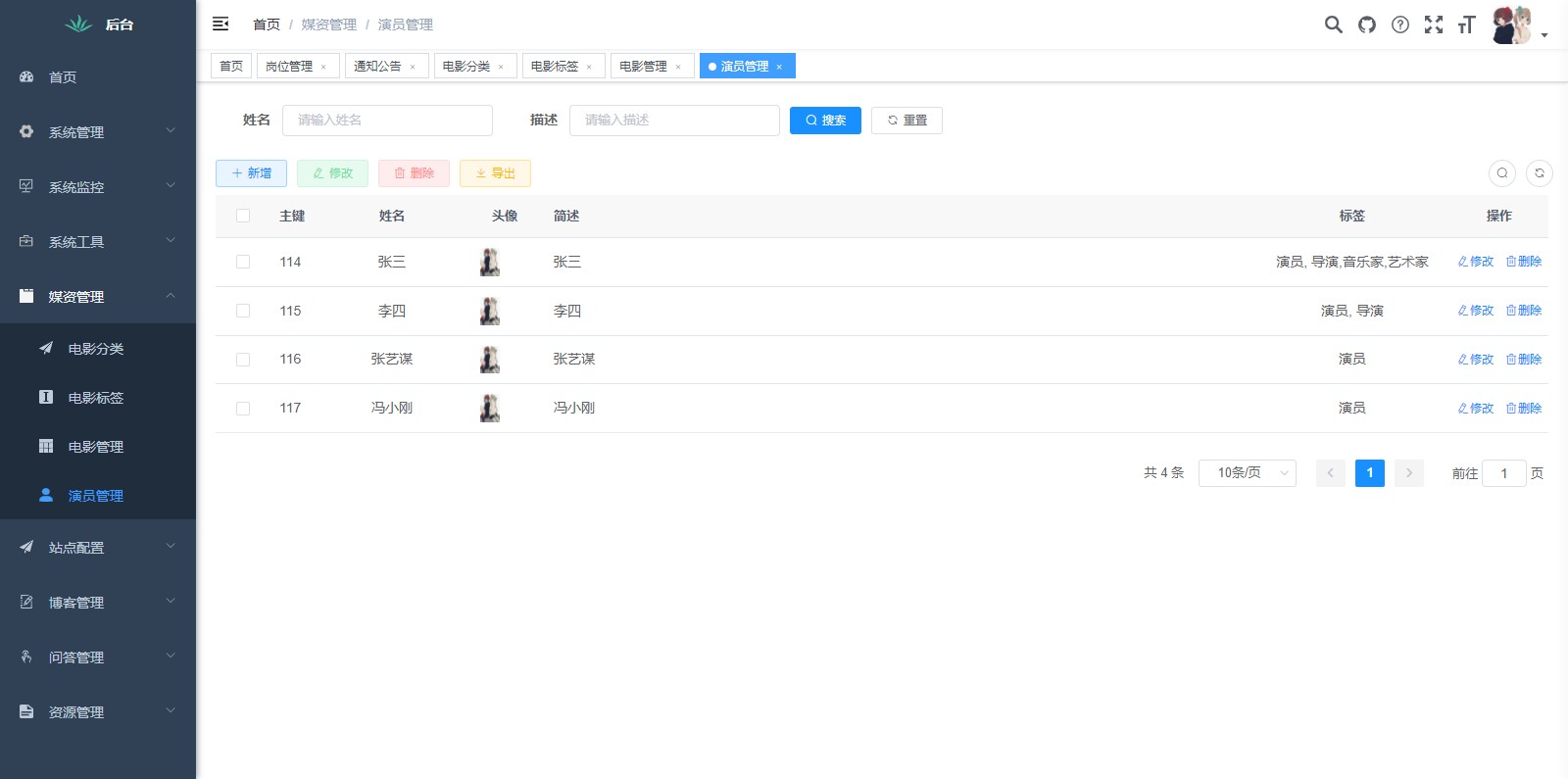 基于SSM+SpringBoot+Vue前后端分离的在线影视视频影院管理系统,包含普通用户,超级管理员角色,整体功能包含视频观看,签到,收藏,登录注册,检索,文章查看,演员整容列表,个人中心,个人信息修改,收藏列表,密码修改,用户管理,角色管理,菜单管理,岗位管理,字典管理,参数设置,通知公告,日志查看,部门管理,电影分类管理,电影管理,演员管理,电影标签,站点配置信息,博客文章管理,标签管理,专题管理,博客分类,网盘资源等。