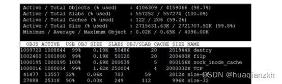 通过slabtop命令可以查看到densty、flip、sock_inode_cache、TCP四个内核对象都分别有100W个: