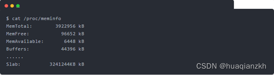当前机器内存总共是3.9GB,其中内核Slab占用了3.2GB之多。MemFree和Buffers加起来也只剩下100多MB了: