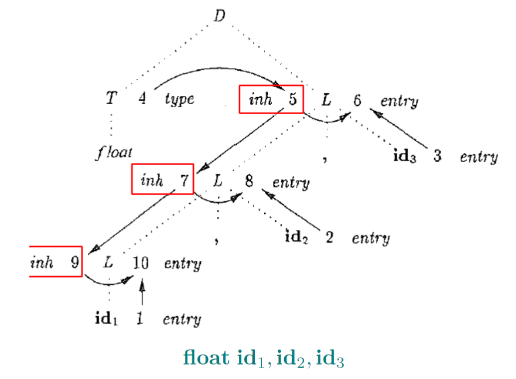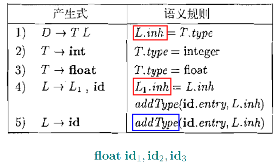 - L.inh将声明的类型沿着标识符列表向下传递,并被加入到相应的符号表条目