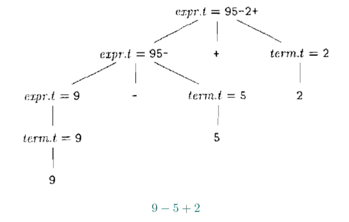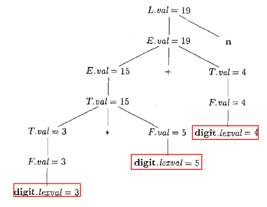 - 显示了各个属性值的语法分析树:3 ∗ 5 + 4