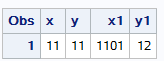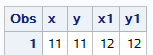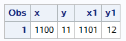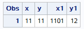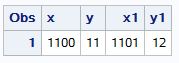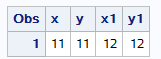 data fs;input x$ y$2.;x1=x+1;y1=y+1;cards;