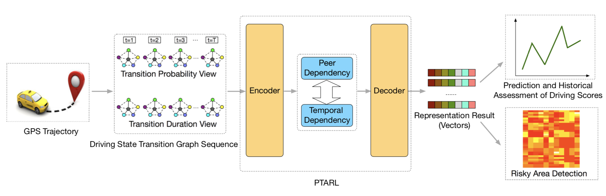 该论文提出了PTARL框架,基于GPS轨迹数据,来分析司机的驾驶行为。该框架图如下图1所示: