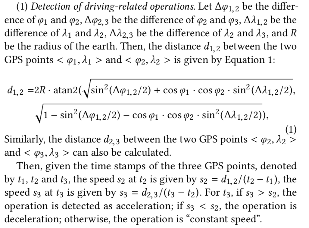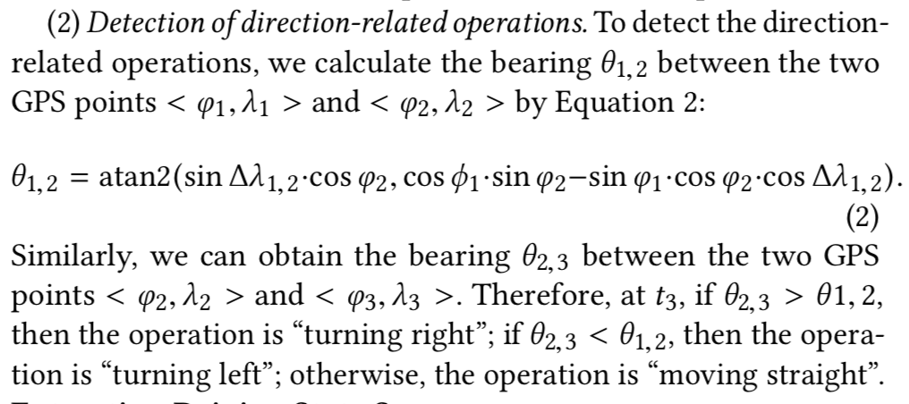 速度与方向的判别,本论文主要是用GPS轨迹数据中的经纬度,根据球面距离公式以及偏航角的计算公式来获得。