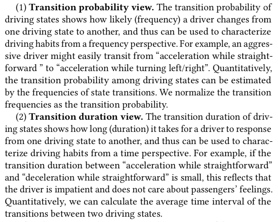 该论文主要的创新点是依据GPS轨迹数据利用驾驶状态转移图来评估司机的驾驶行为;但个人感觉存在的问题,如下:1)当在无GPS场景或弱GPS场景下(或GPS缺失的情况下),如何来保证其方法的有效性。2)在计算GPS点之间的距离,是否可以结合体其他交通数据,来提高模型的精度。