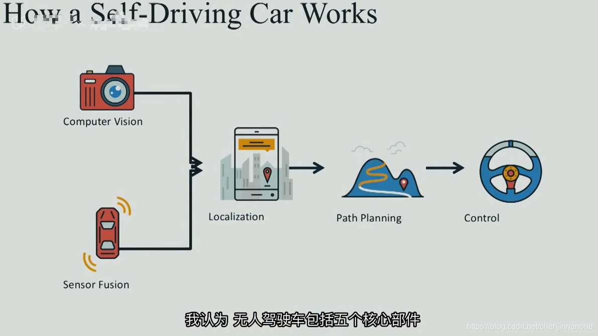 无人驾驶车包括五个核心部件:计算机视觉 传感器融合 定位 路径规划 控制