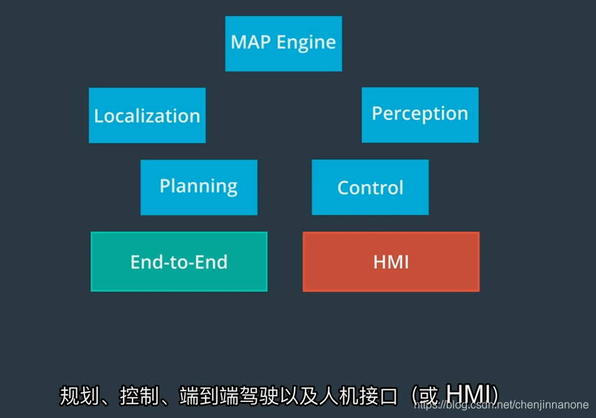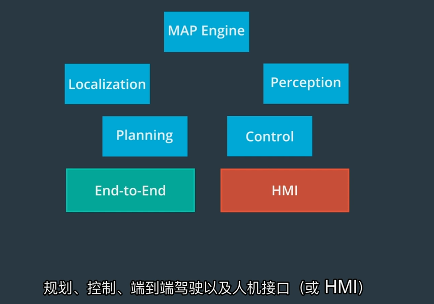 应用程序模块:MAP引擎 定位 感知 规划 控制 端到端驾驶 人机接口(HMI).