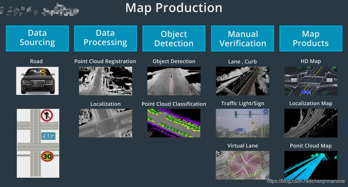 高精度地图的构建五个部分:数据采集 数据处理 对象检测 手动验证 地图发布