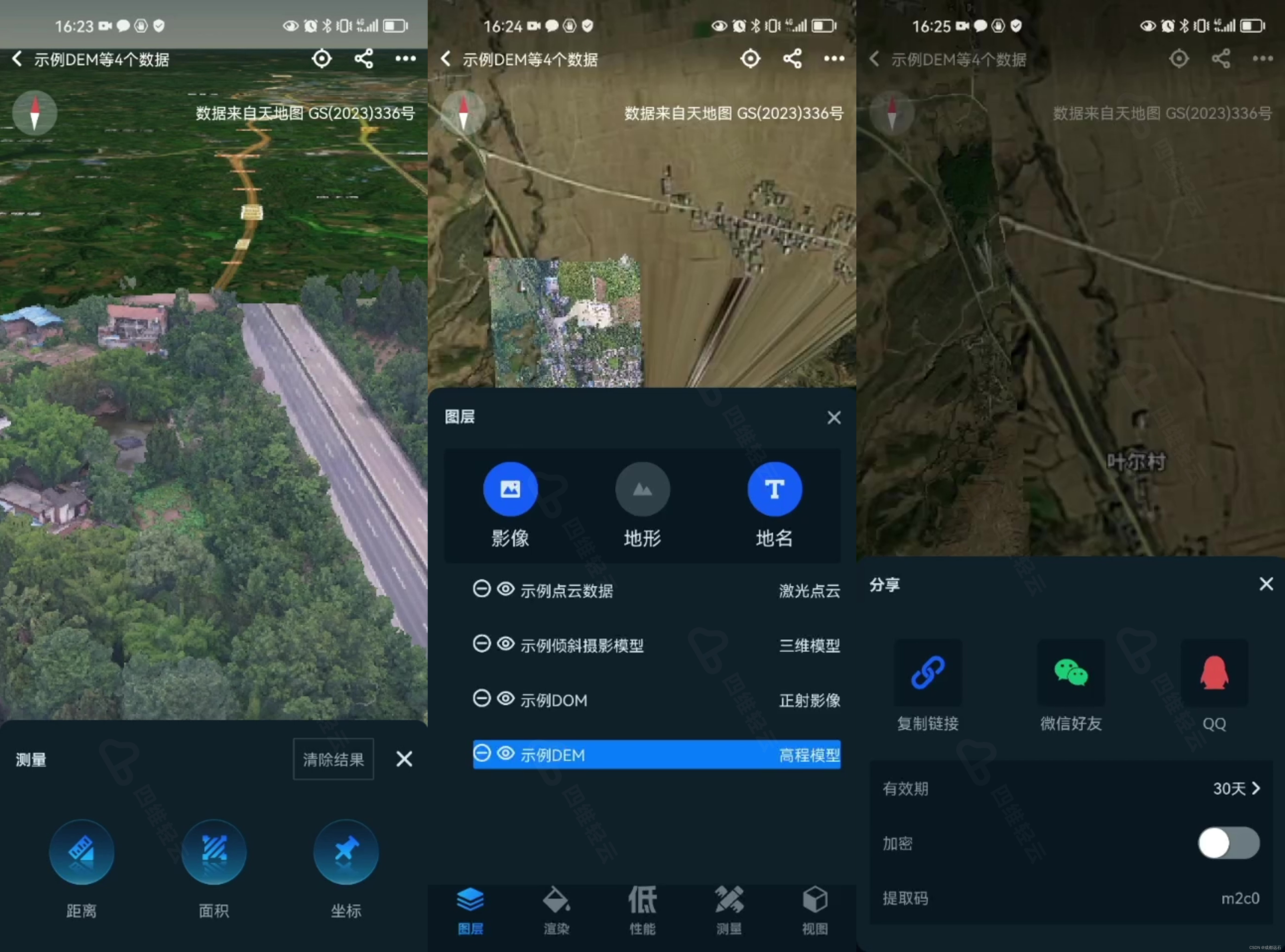 用户可以将数据加载至地图中查看,并使用空间测量、点云渲染、视图切换等功能对数据进行编辑,还可以将数据以链接的形式分享给微信或QQ好友