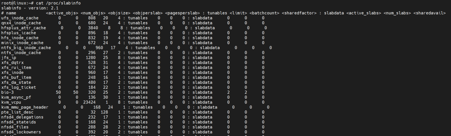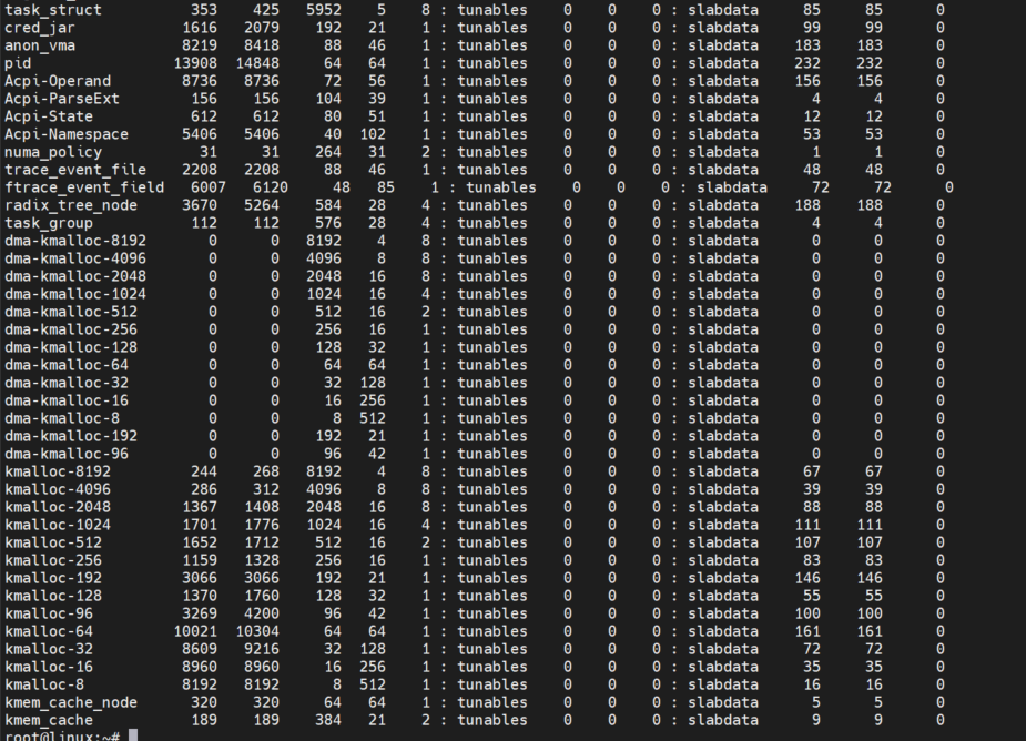 linux 系统当中有很多这样的 slab ,因为有很多数据结构要用到的,可以通过 /proc/slabinfo 来查看 系统里的 slab 分配的情况