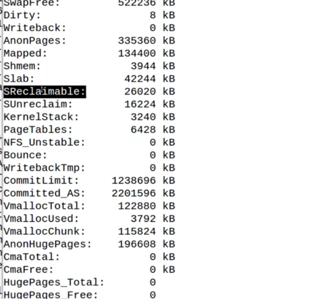 可以看到 slab一共有多大,SReclaimable 是可回收的slab有多大(文件系统中的icache dcache,可以手动回收)。SUnreclaim 是不可回收的(自己在驱动写的kmalloc,一般都是标志成不可回收的)。