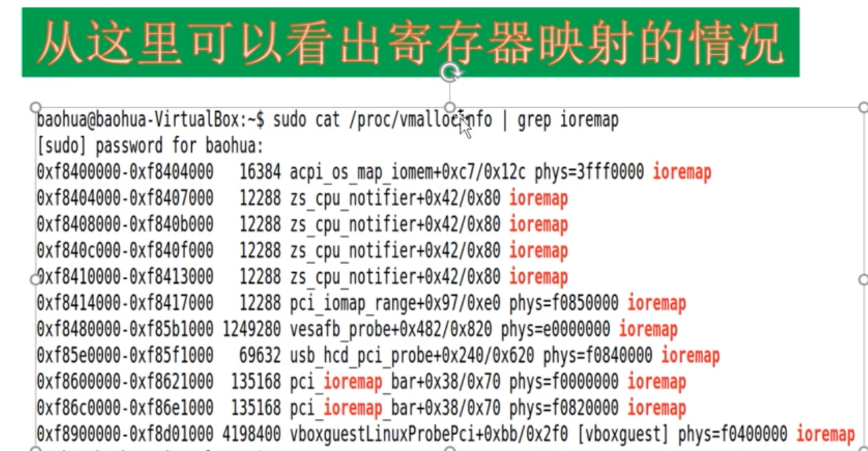 - vmalloc 和 ioremap 都是以 page为单位的,关于 vmalloc 的区域 可以看 /proc/vmallocinfo
