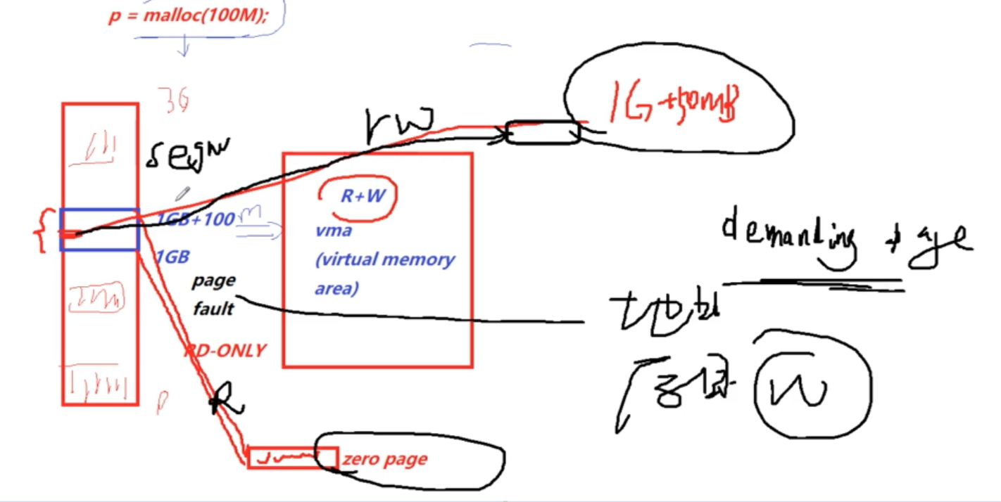 malloc(100M) 首先会在空闲的堆空间中 找到100M的空间,比如1GB -- 1GB+100M ,(这100M的空间都会被指向 一个页 zero page ,这个一开机的时候就决定了,