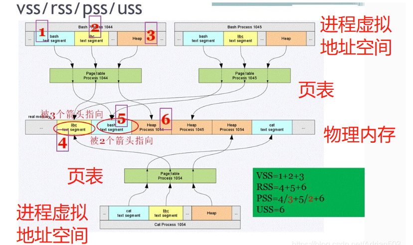 但是是不是“4+5+6”就是1044这个进程耗费的内存呢?这显然也是不准确的,因为4明显被3个进程指向,5明显被2个进程指向,坏事是大家一起干的,不能1044一个人背黑锅。