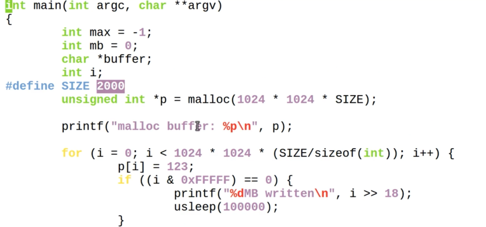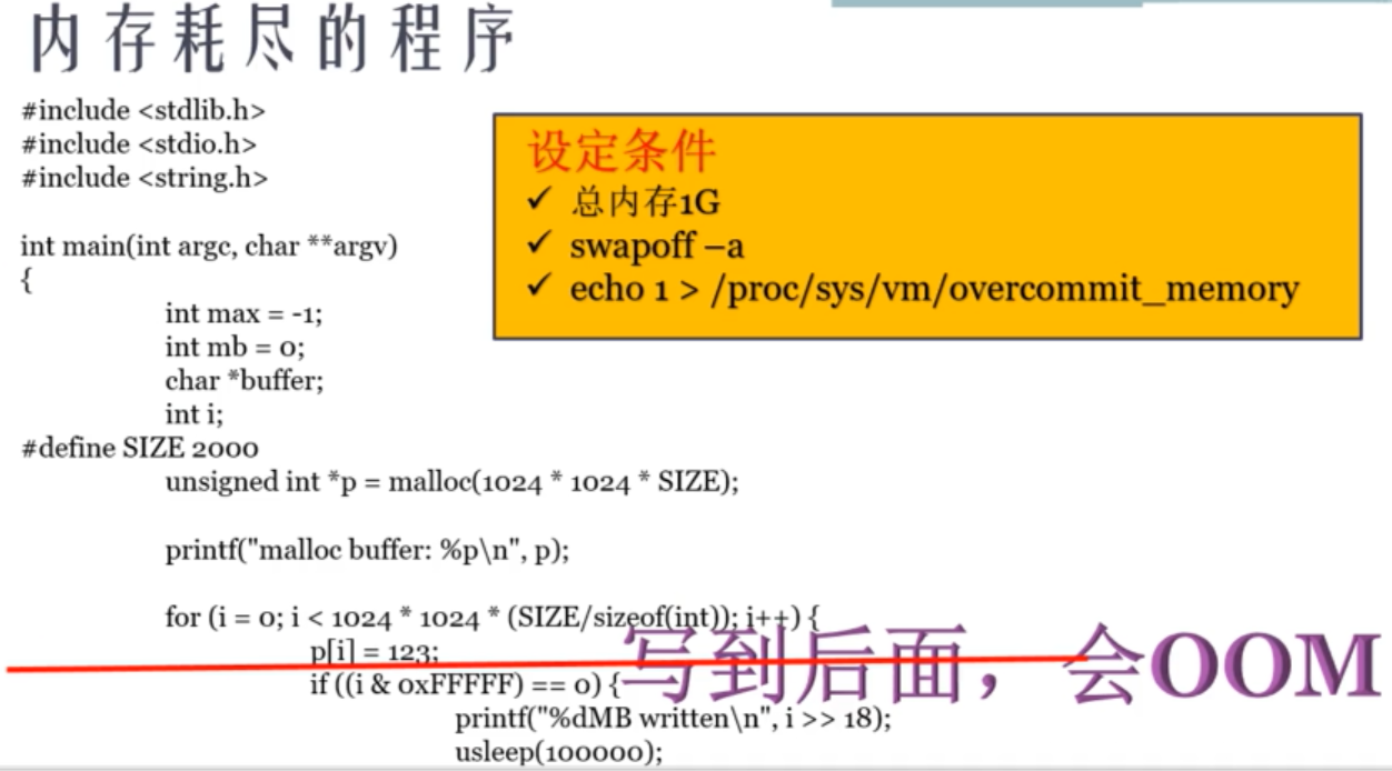- 写一个整型 i , 是写了4个字节,申请了 2000MB的内存,i >> 18 是写了多少MB = i*4/ 2^20