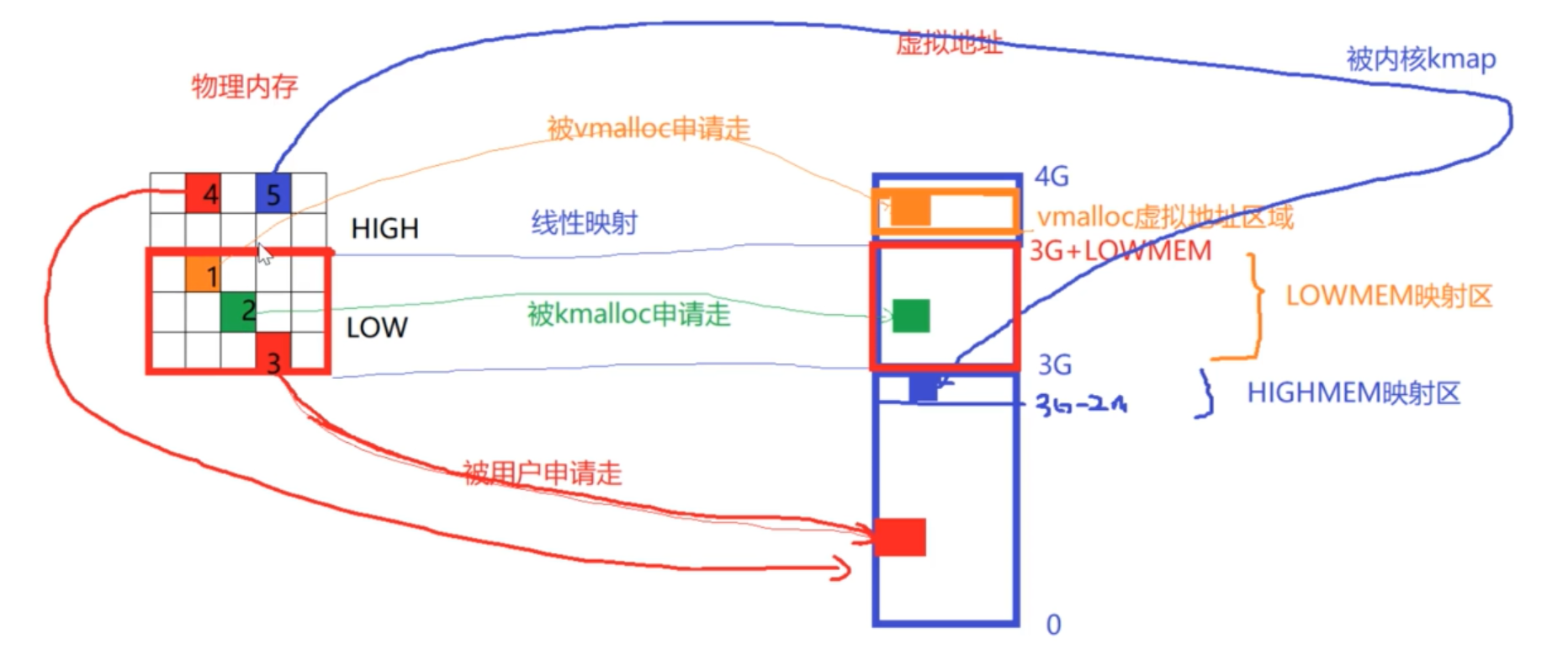 - 注意低端内存一开机就被映射到内核空间,并不是被内核用掉了,它还是空闲的,受buddy 管理(buddy是管谁是空闲的,保证你每次申请拿到的都是空闲的页,buddy非常清楚哪些页是空闲的,哪些是被占用的),所有被映射和被申请是两码事。