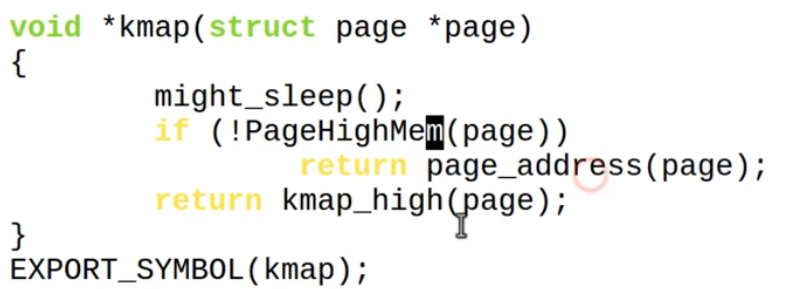 - 内核里还是经常用到 kmap的,但是kmap 一般都是一些临时性的动作,用完一般就会 umap掉了,比如在内核里你只知道物理地址,但是不知道虚拟地址,你就可以使用kmap来做,就是可以在内核里临时访问某个页面(已经存在),所以不涉及一个申请的行为。kmap 也不是只能访问高端内存,如果传入的参数不是高端内存,直接就会返回低端内存的地址,如果是高端内存,才会去映射。