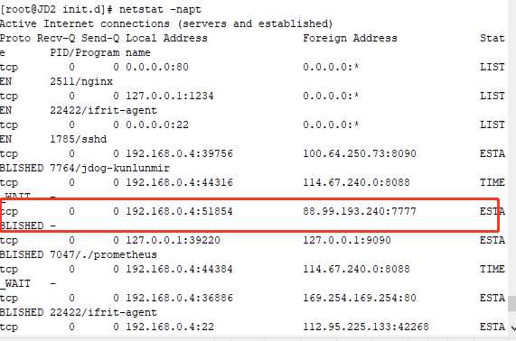 部长看着netstat,说到:“正好,趁着这个功夫,你先来看看现在有没有对外可疑的连接”