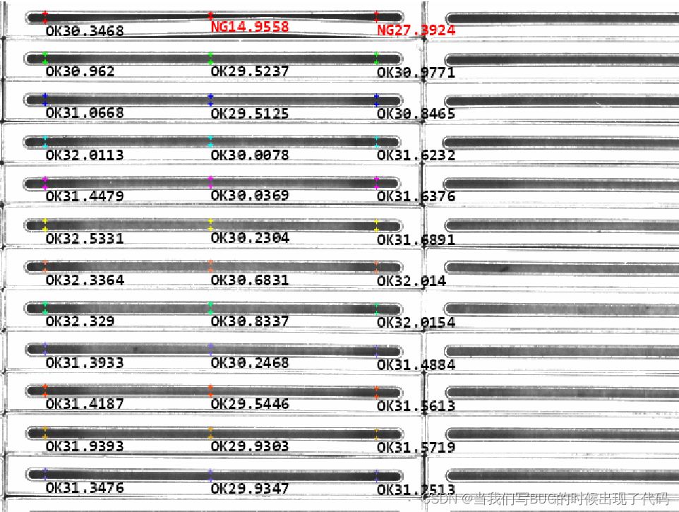 for I := 0 to |Width_Measure_01_0|-1 by 1if (Width_Measure_01_0[I]>28)I1:='OK'I2:='black'elseI1:='NG'I2:='red'endifdisp_message (WindowHandle, [I1+Width_Measure_01_0[I]], 'image',Row2_Measure_01_0[I], Column2_Measure_01_0[I], I2, 'false')if (Width_Measure_01_1[I]>28)I1:='OK'I2:='black'elseI1:='NG'I2:='red'endif disp_message (WindowHandle, [I1+Width_Measure_01_1[I]], 'image',Row2_Measure_01_1[I], Column2_Measure_01_1[I], I2, 'false')if (Width_Measure_01_2[I]>28)I1:='OK'I2:='black'elseI1:='NG'I2:='red'endif disp_message (WindowHandle, [I1+Width_Measure_01_2[I]], 'image',Row2_Measure_01_2[I], Column2_Measure_01_2[I], I2, 'false')