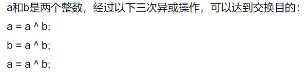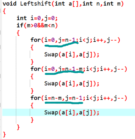 a)int main 里面:m%=n //将m转化成等价 b)Leftshift()函数里面:有个if(m>0&&m 三.具体操作: 1)逆序的实现: 使用Swap函数将最开始和最末尾的数字交换,接着第二个数字与倒数第二个数字交换...... #define Swap(a,b) a^=b,b^=a,a^=b a)!!!!中间有逗号','!!!!理解清楚define是替换 b)通过连续三次异或运算交换a和b 原理: 2)输出的方法: 先输出第一个数,后面printf(" %d"); printf("%d",a[0]); for(i=1;i 3)Leftshift()中 怎样利用宏定义define 实现逆序: 三个for循环! 四.代码: #include int print(int a[],int n) int main()