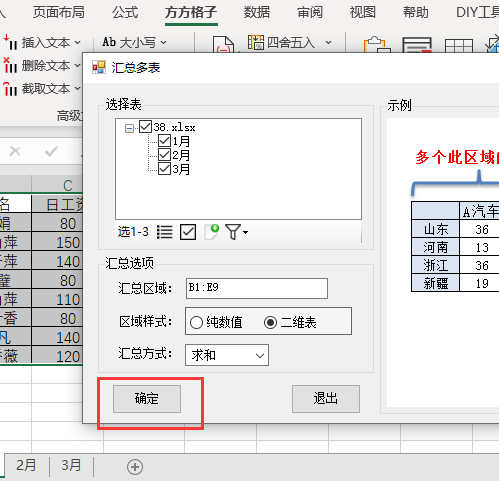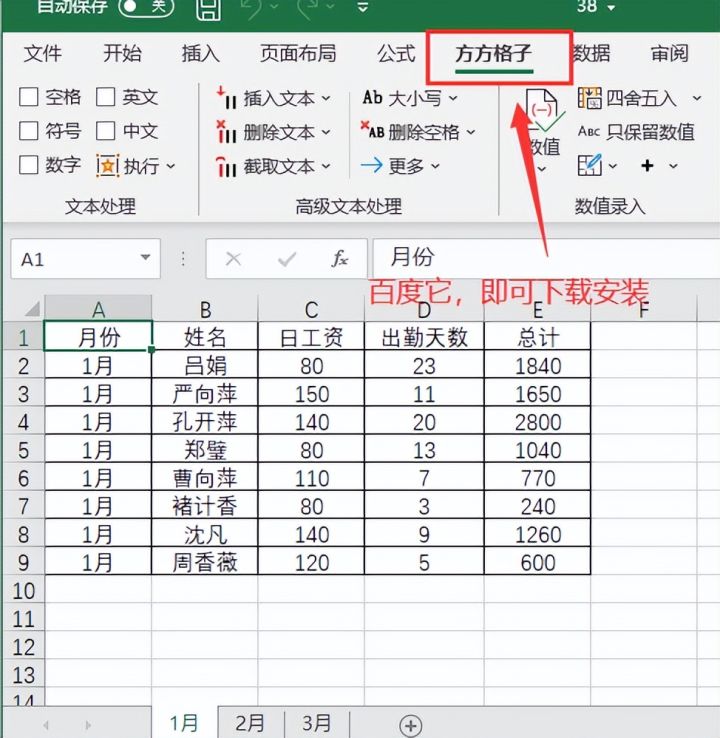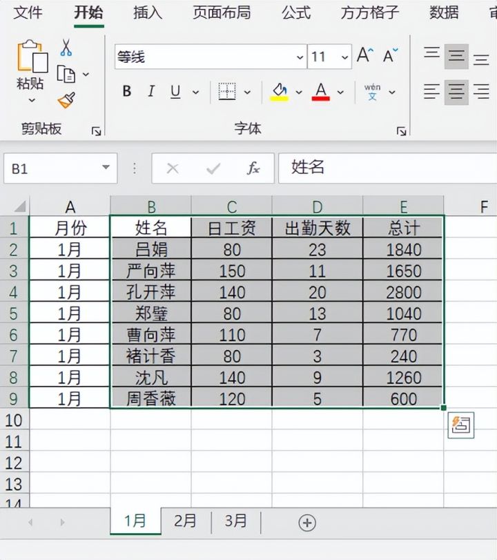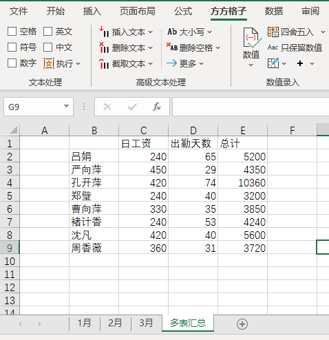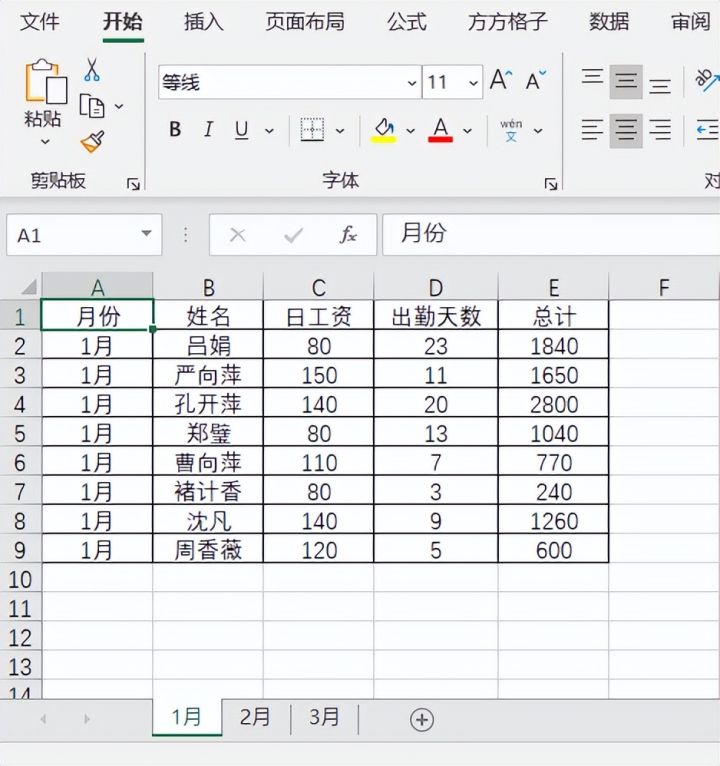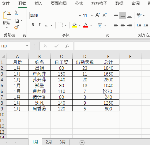 1.如下图工作簿中含有多个工作表,分别是某公司三个月工资表。现在我们想要快速汇总出每位员工这三个月的工资总和。