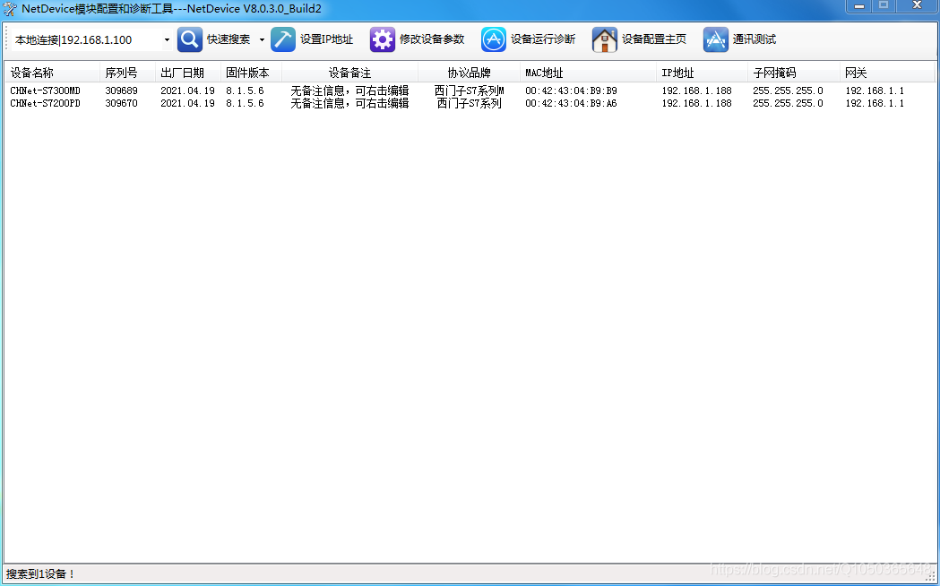 例:兴达易控CHNet-S7300MD,IP地址:192.168.1.188,S7TCP目标PLC地址:2;