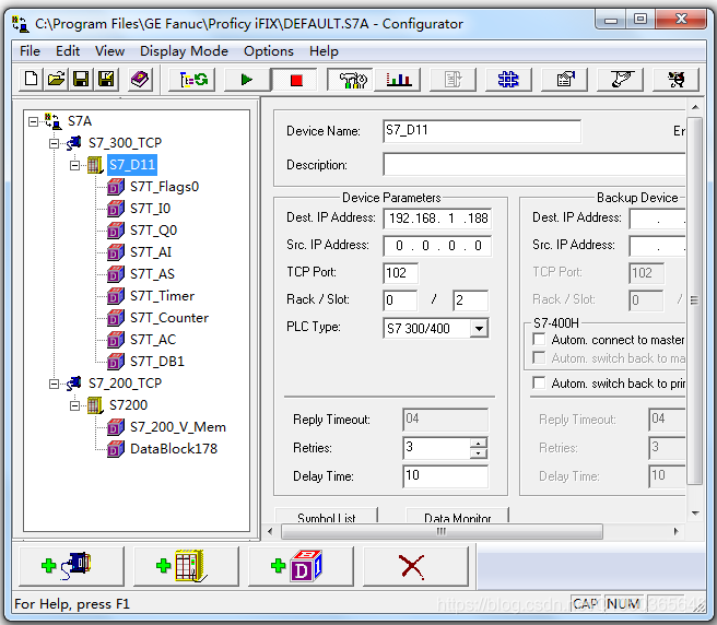 2) “Dest IP Address”,填入CHNet-S7300MD模块的IP地址:“192.168.1.188”; “Tcp Port”,填入:“102”; “PLC Type”,选择:“S7300/400”;其他参数默认。