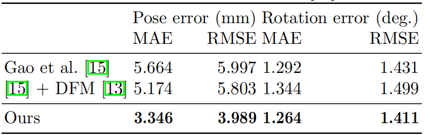 上图对比了其他的标定方法。Gao等人标定了两个GoPro相机和一个Kinect RGB-D相机。在我们的比较中,我们用超广角RGB加ToF模块代替RGB-D相机,用浮动主相机代替GoPro相机。Gao等人的标定精度比我们的要低得多,即使该方法使用最先进的特征匹配器DFM。此外,只有我们的方法能够标定相机内参和畸变参数。