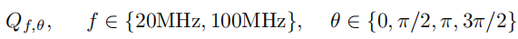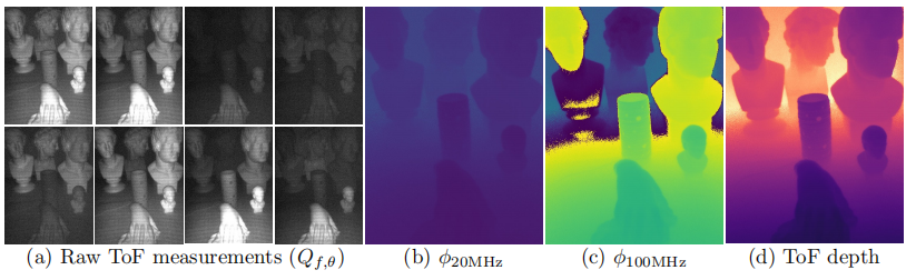 ToF系统使用20MHz和100MHz方波调制其红外光源,并在两个频率之间交替。传感器每个频率通过Four-Sampling-Bucket算法,获得4个相位延迟为0°,90°,180°和270°的采样信号 Q f , θ Q_{f,\theta} Qf,θ。使用两个频率,我们每次快照可以获得八个原始ToF测量值(上图a):