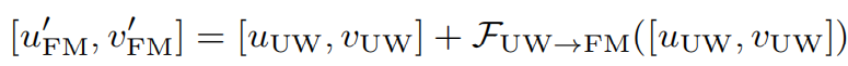 下一步是将超广角相机与浮动主相机进行精确标定。由于两个相机位于彼此附近,它们具有相似的视点,因此无需进行稀疏尺度和旋转不变的特征匹配。基于此,本文使用密集的光流来进行特征匹配找到对应关系。为了使用光流,首先对超广角相机去畸变,然后使用离线标定的结果进行极线矫正(Rectify)。由于浮动主相机的内外参一直是变化的,这种矫正是错误的,但是由于光流设计用于小范围的非约束图像到图像对应,因此这种矫正方法仍然会找到有用的对应关系。作为输出,我们得到了两个相机匹配好的匹配2D向量场 F U W → F M F_{UW→FM} FUW→FM。