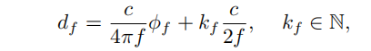 对于每个调制频率,首先计算发射信号和接收信号的相位差 ϕ f \phi_f ϕf (measured phase/raw phase),通过计算发射光与反射光的相位差来计算每一个像素点到相机的距离 d f d_f df: